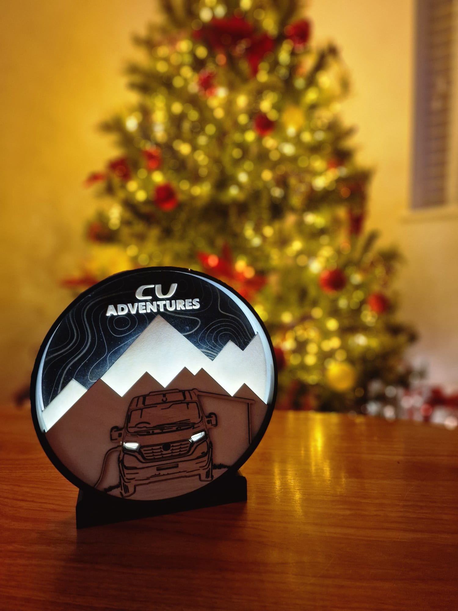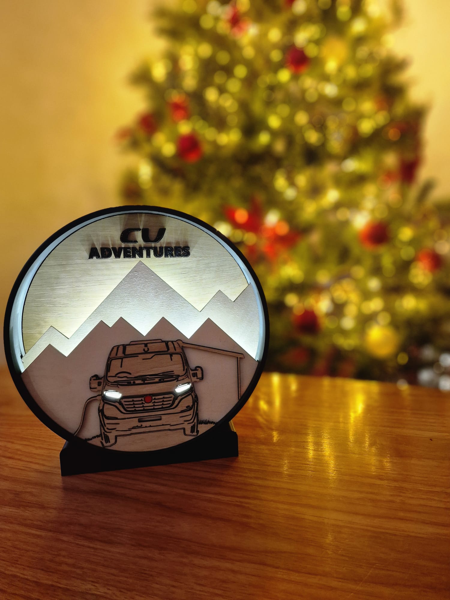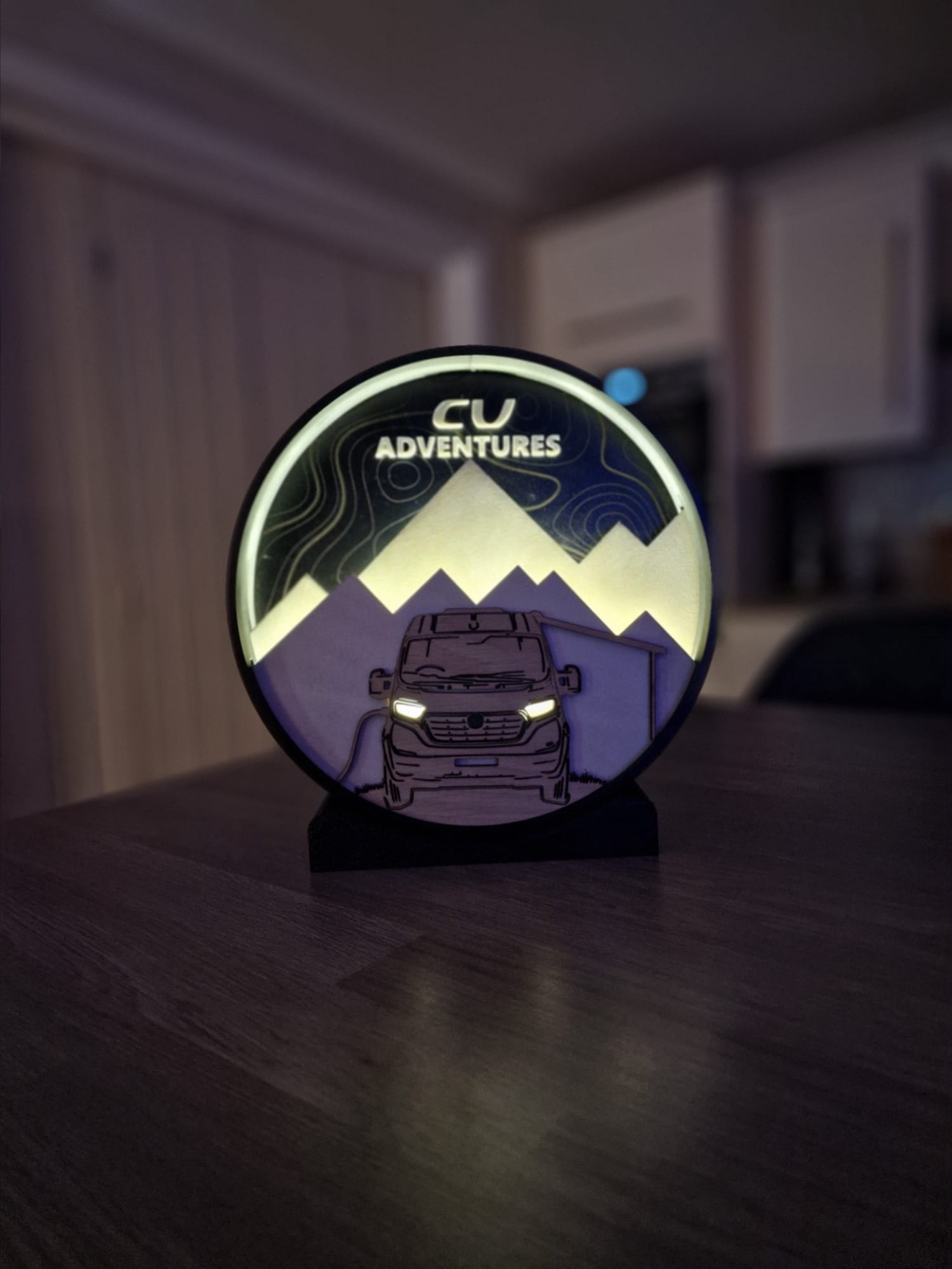 The light shines up behind both mountain peaks to imitate the sun rising or setting. The headlights also glow when the light is on.