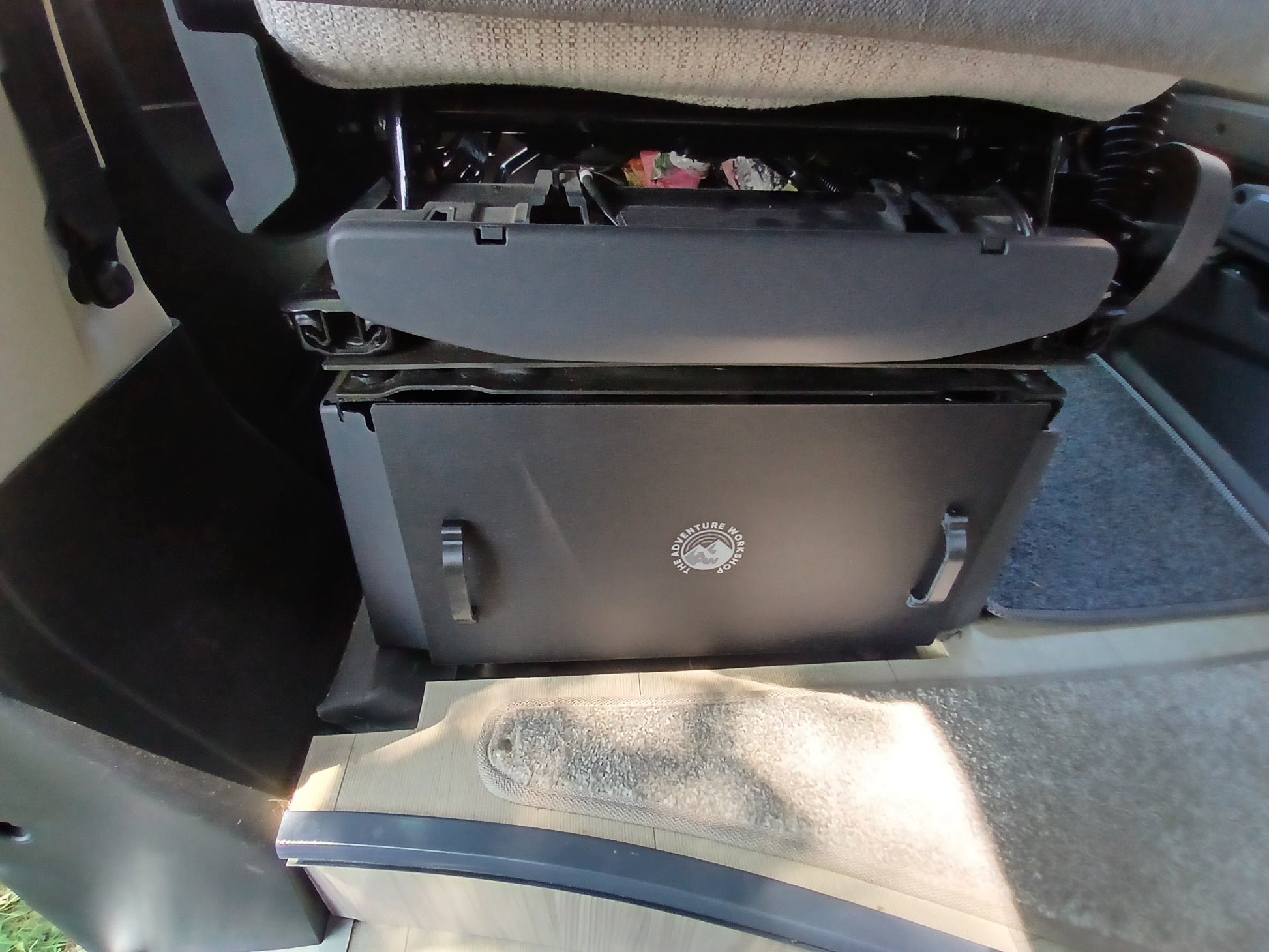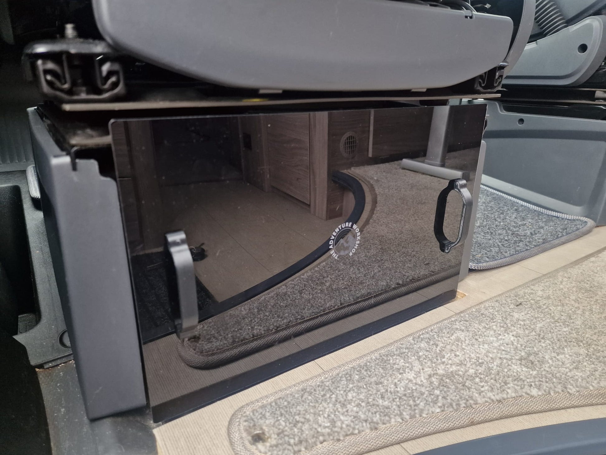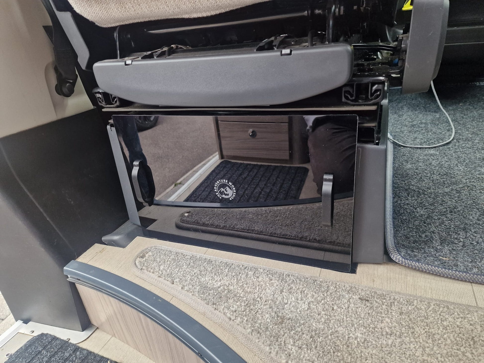 A lift off and off seat door for the Fiat Ducato campervans. Gloss black doors with hooks and magnets allow you to take the doors off in seconds to access under the seat. Very easy to fit.